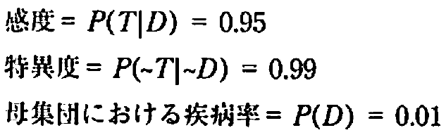 臨床医なら、この検査の感度は95%であり、特異度は99%と言う。また、母集団における疾病率は1%であるとします。